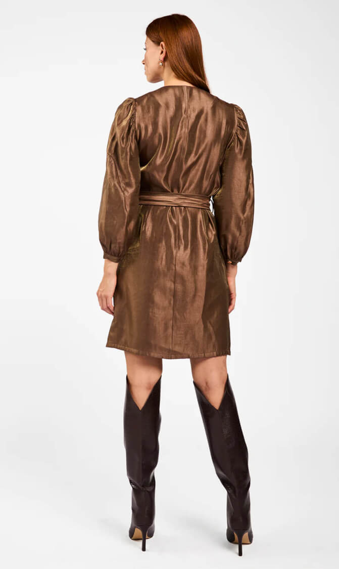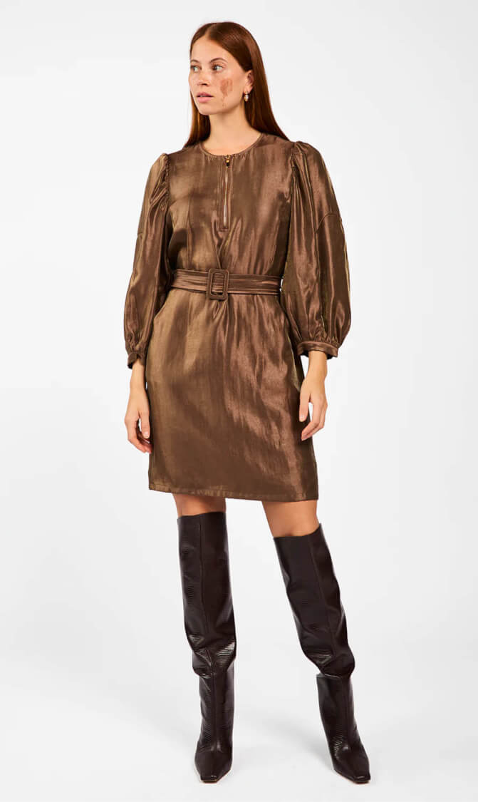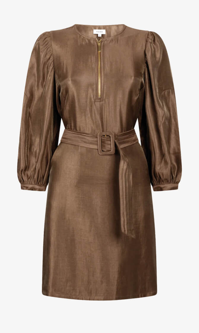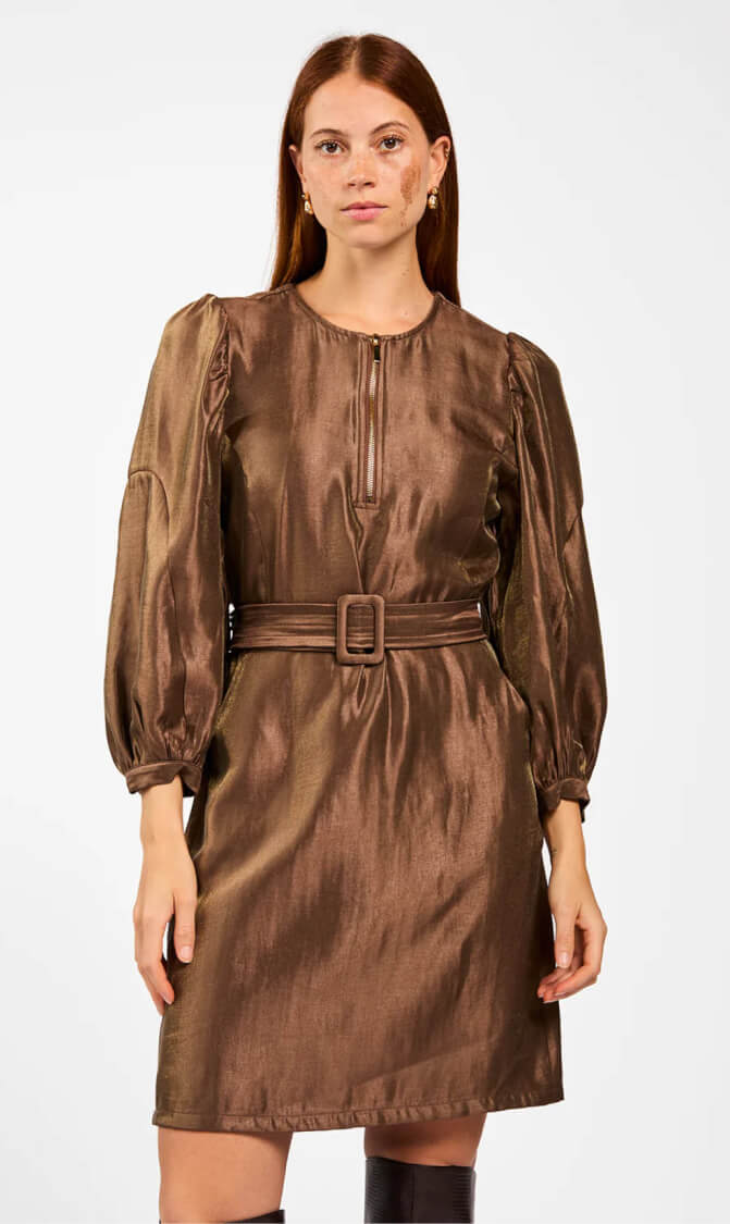 De Semira jurk in warme bruin glans is een stijlvolle en veelzijdige toevoeging aan je garderobe. De lange pofmouwen en ronde hals stralen verfijning uit, terwijl de rits bij de hals zorgt voor een modern accent.