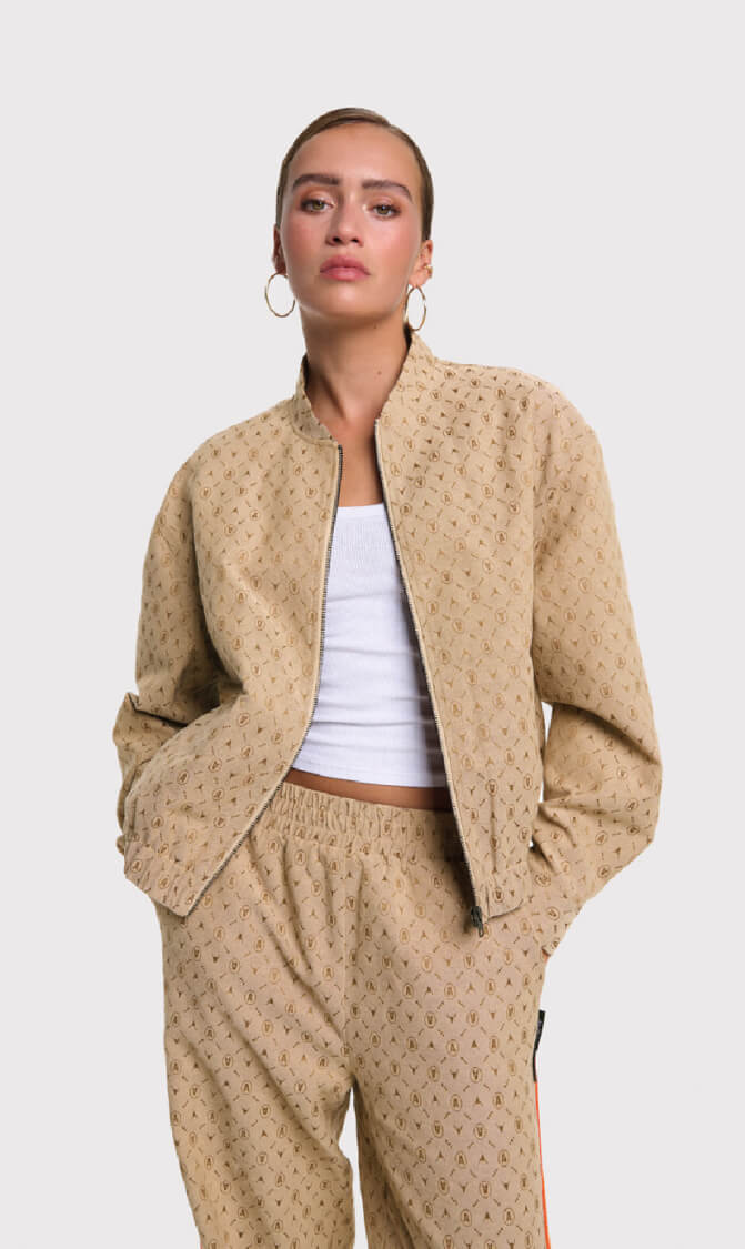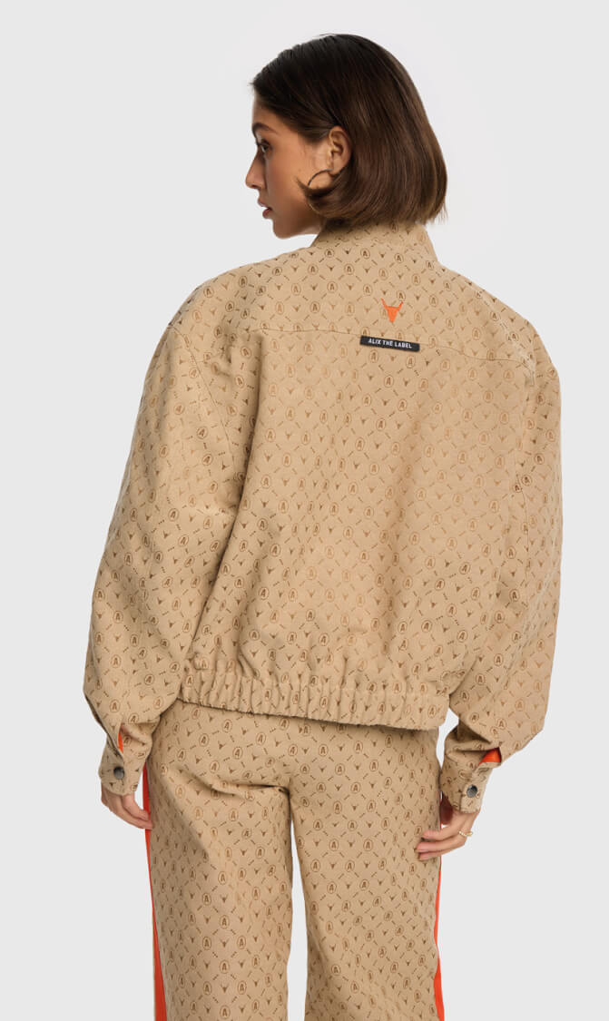 Ontdek het Alix The Label Logo Jacket, een oversized jas gemaakt van luxe geweven jacquardstof. Dit opvallende jack is ontworpen met een all-over Alix logo jacquard patroon en combineert comfort met een modieuze uitstraling.