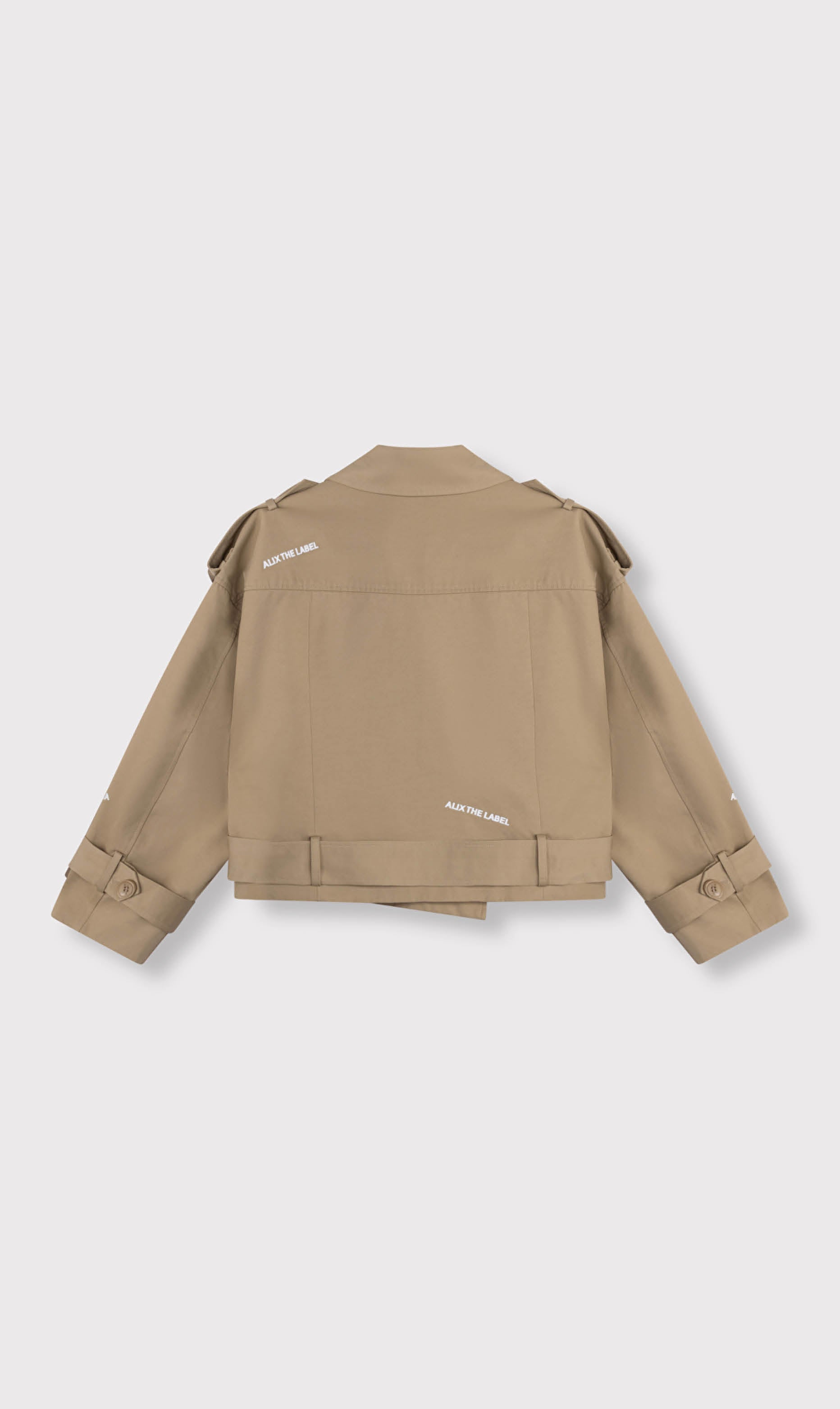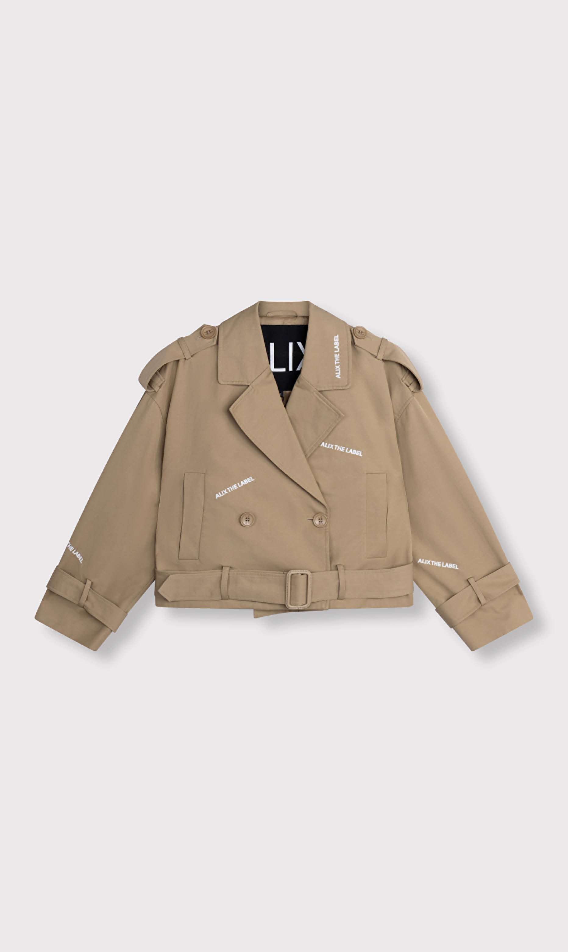 De jas is afgewerkt met een riem aan de onderkant en all-over “ALIX” borduursels voor een opvallend detail.