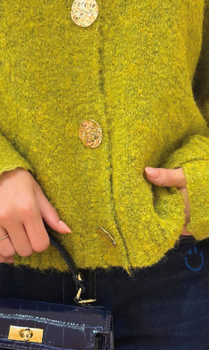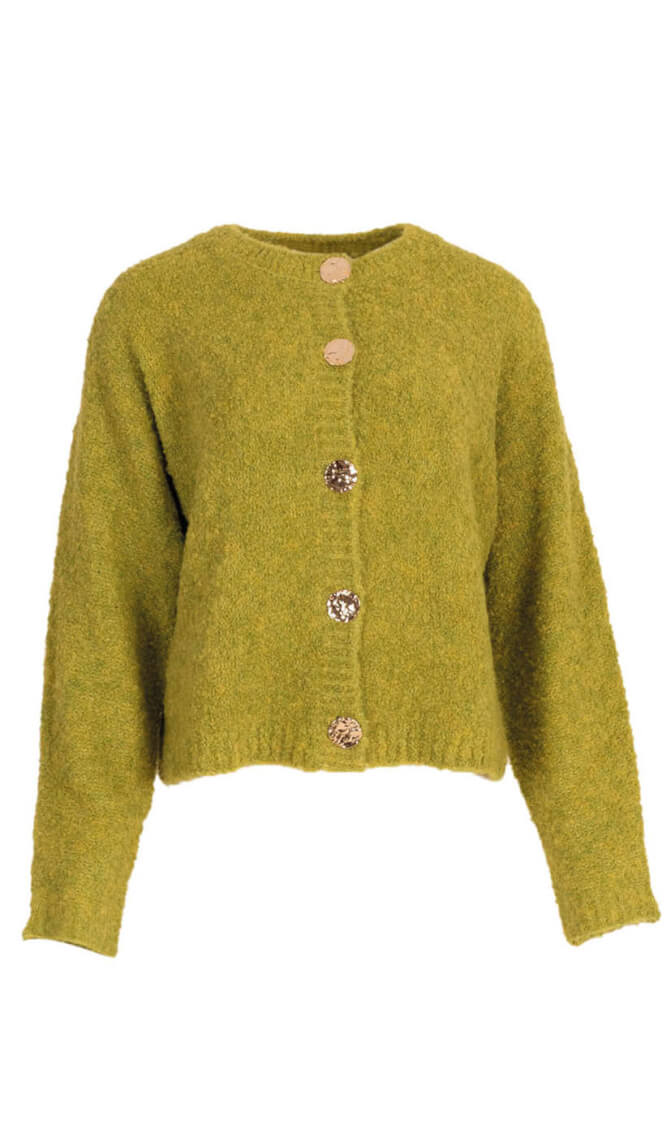 Dit vest heeft goud kleurige knopen aan de voorzijde.